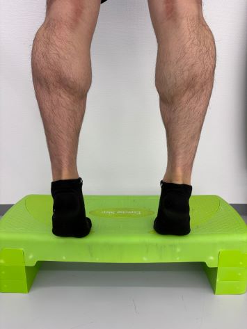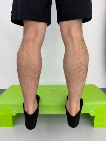 - 段差などを利用して、かかとをゆっくり下げる動作を痛みの許容範囲で行う