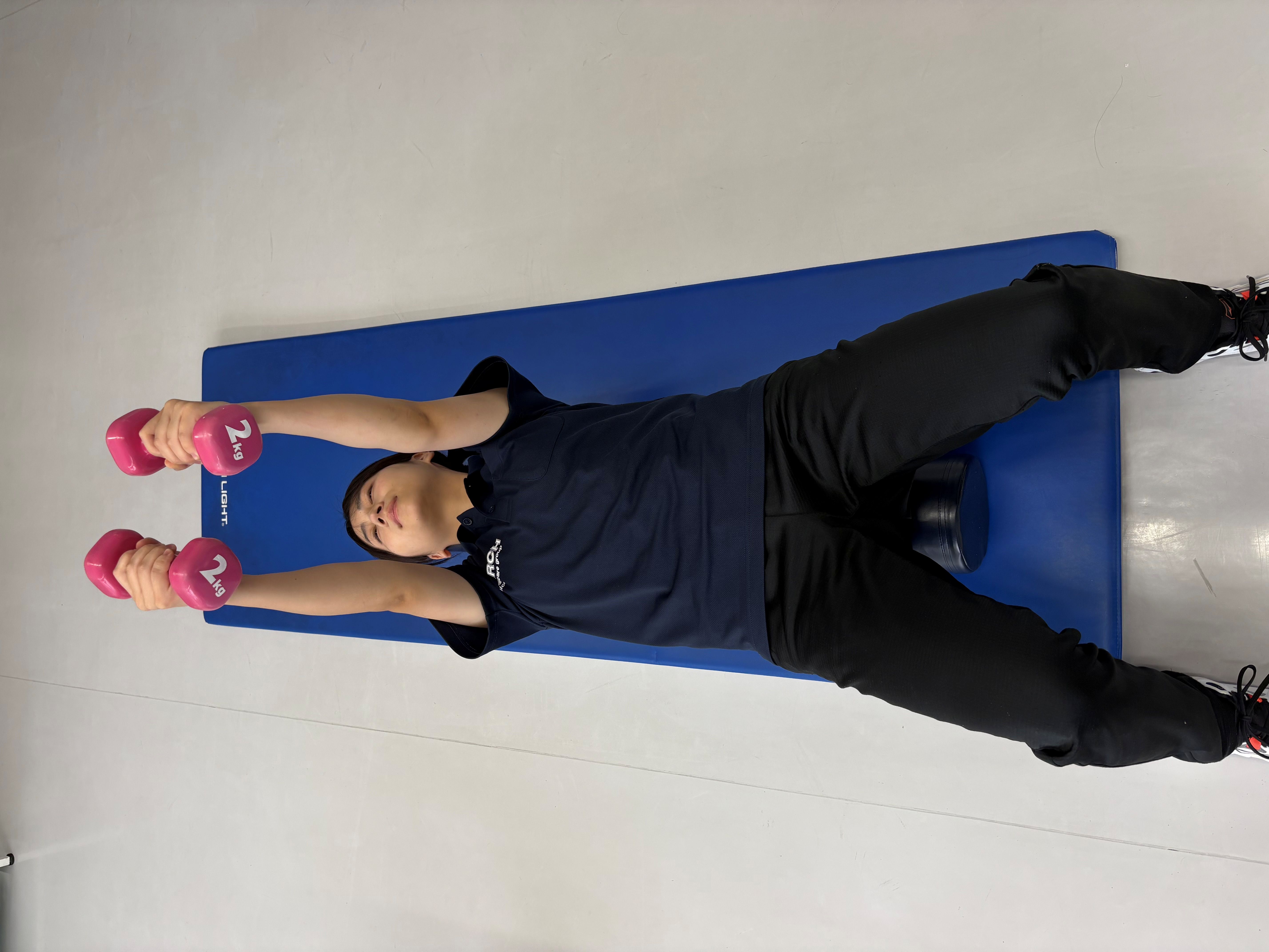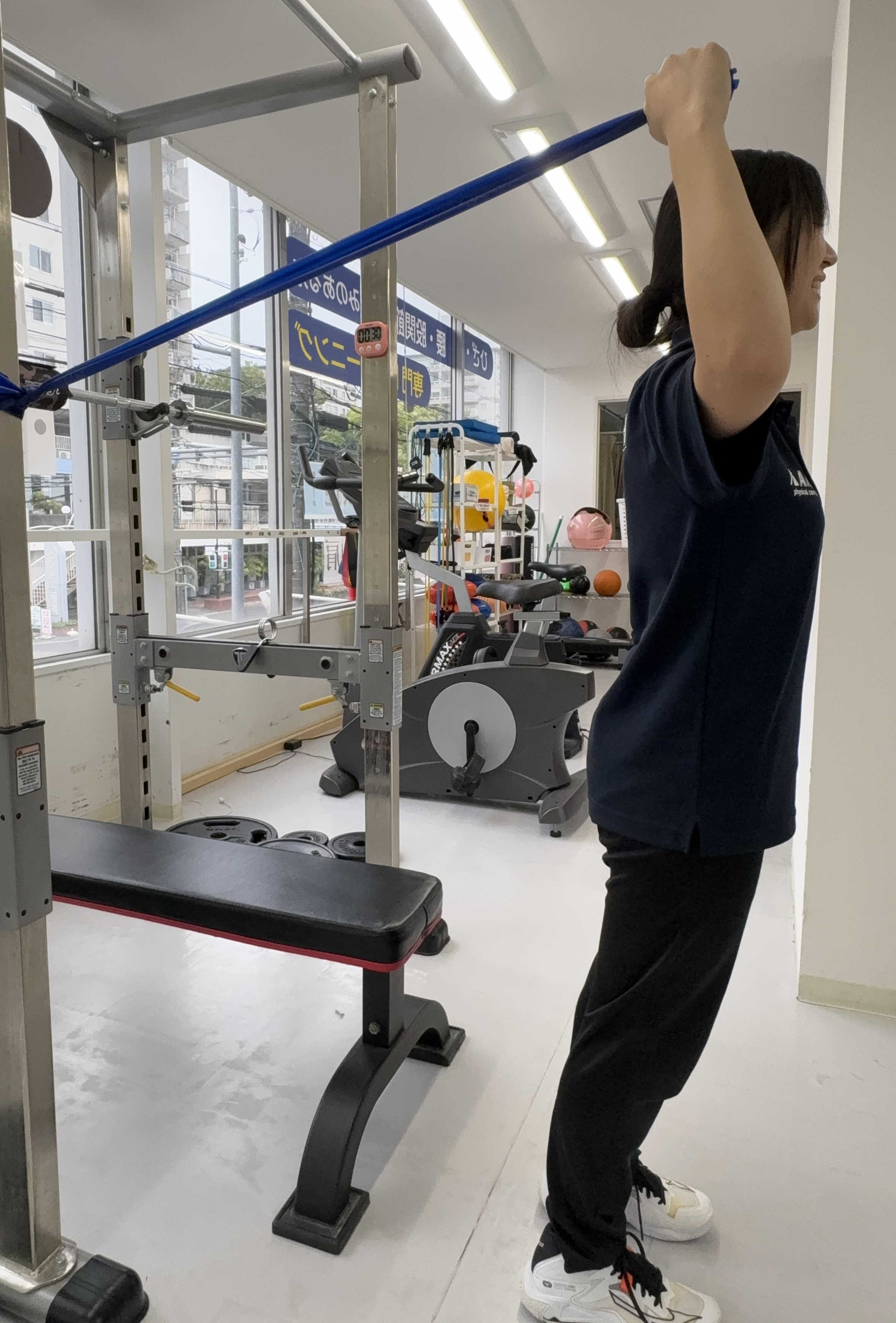 身体は真っ直ぐで手を重ねた状態で腕を後ろへ引く90度近くまで上がればOK