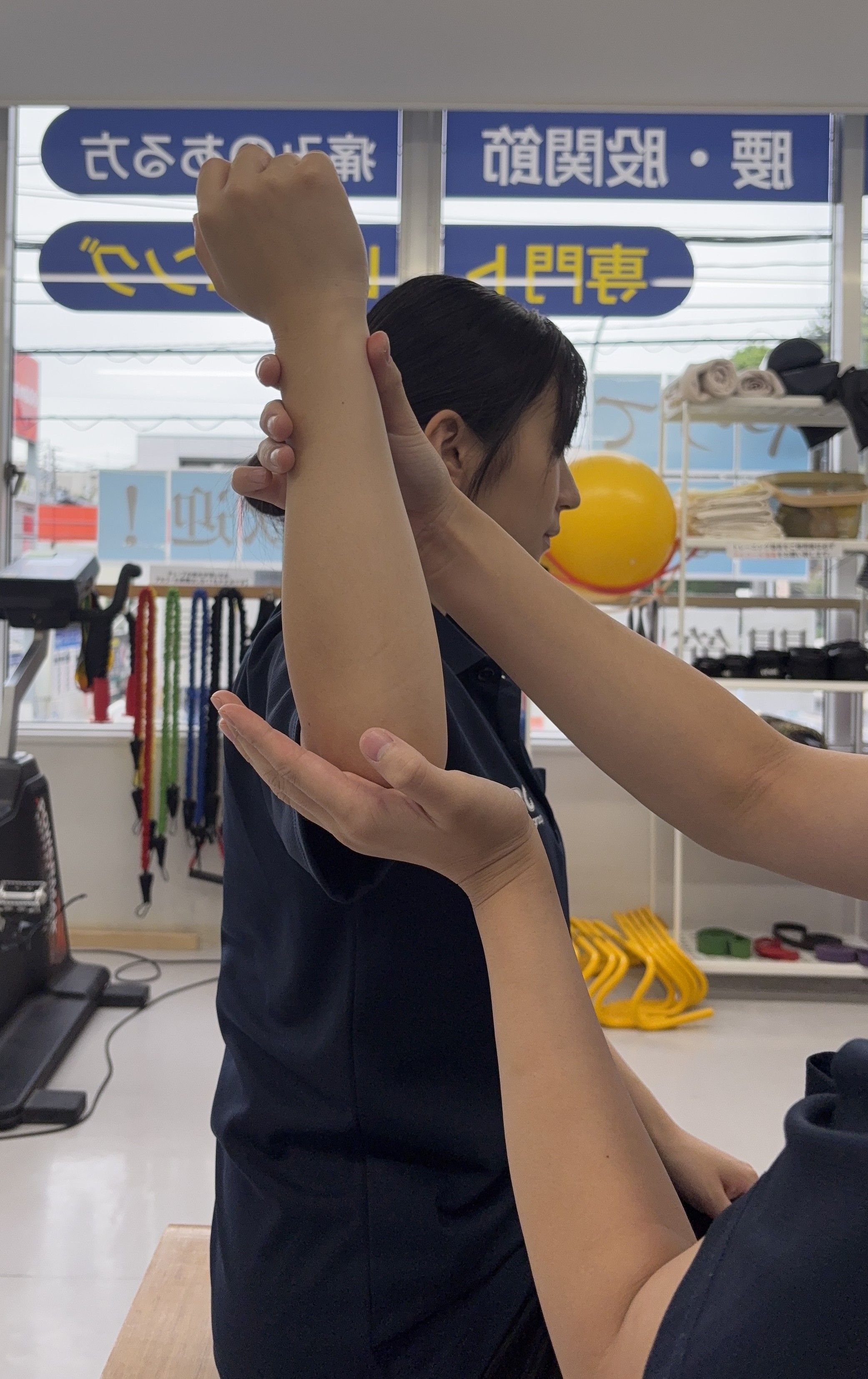 座った状態で手と肘を保持して可動域確認(セカンドポジション)
