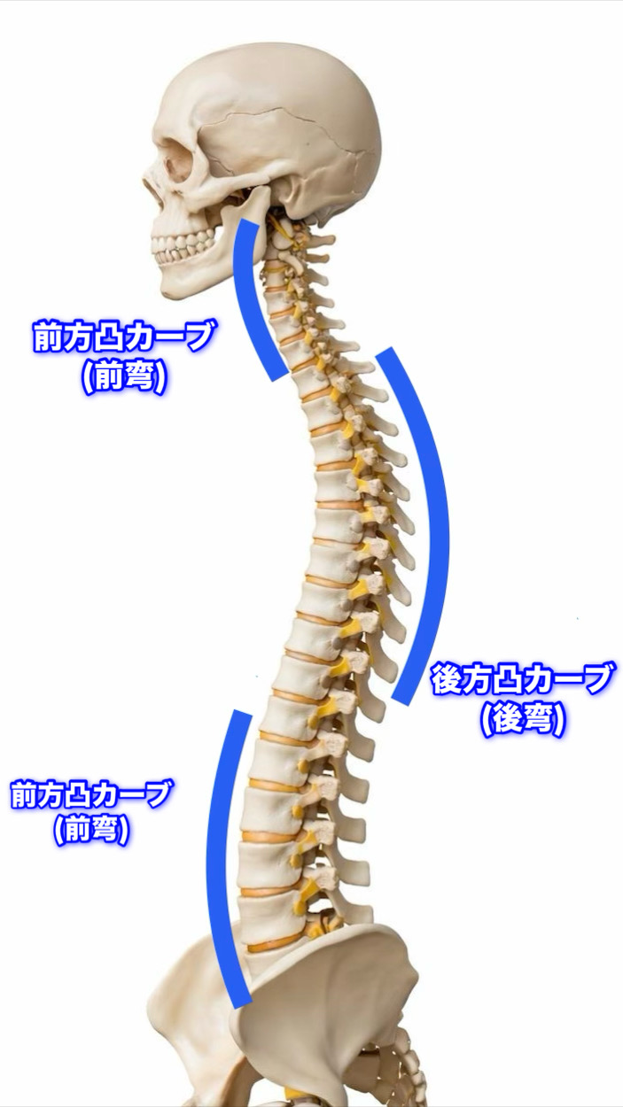 首部分で前方凸のカーブ(頸椎前弯)、胸部付近で後方凸のカーブ(胸椎後湾)、腰付近で前方凸のカーブ(腰椎前弯)が緩やかにある状態です。