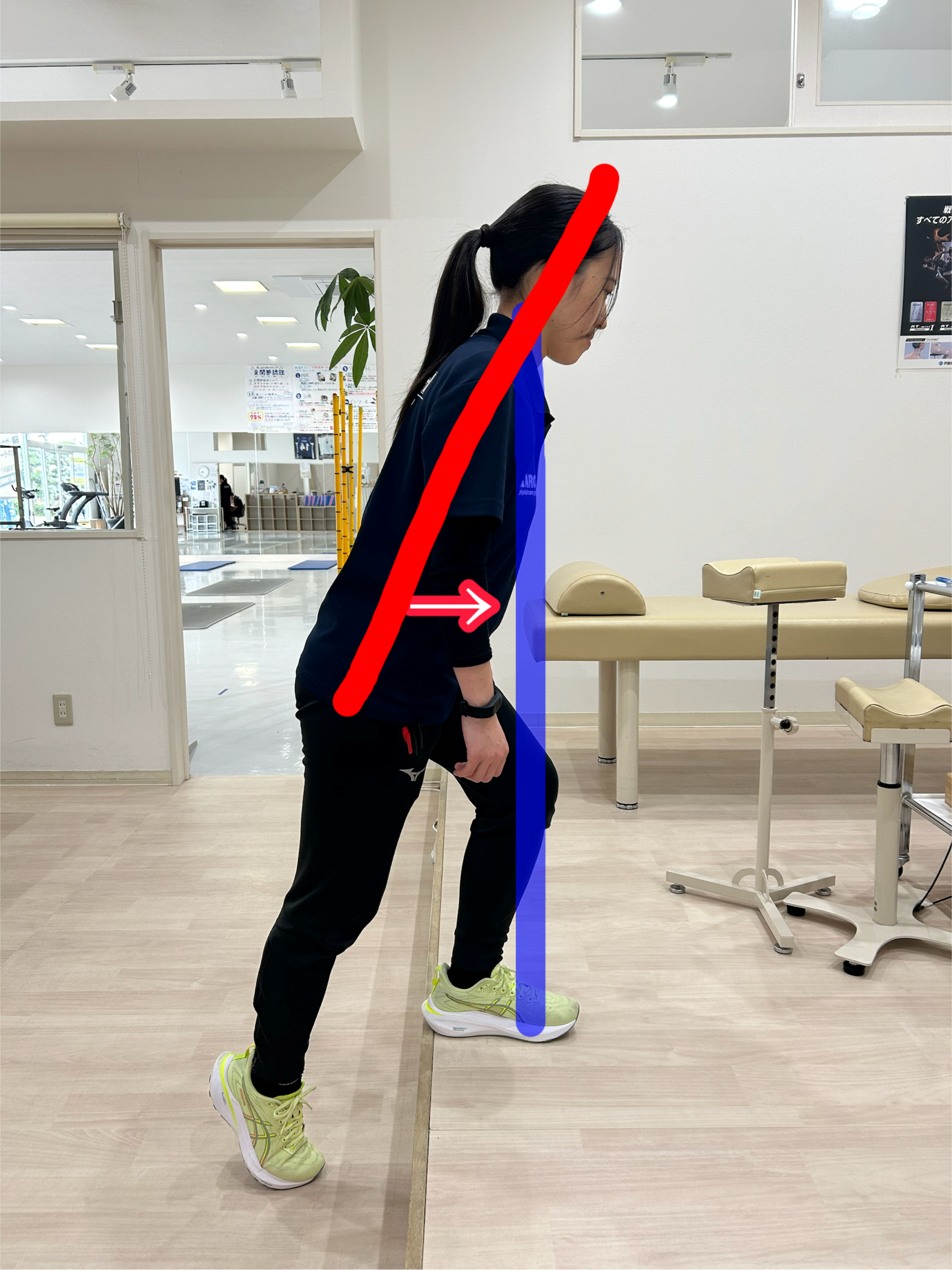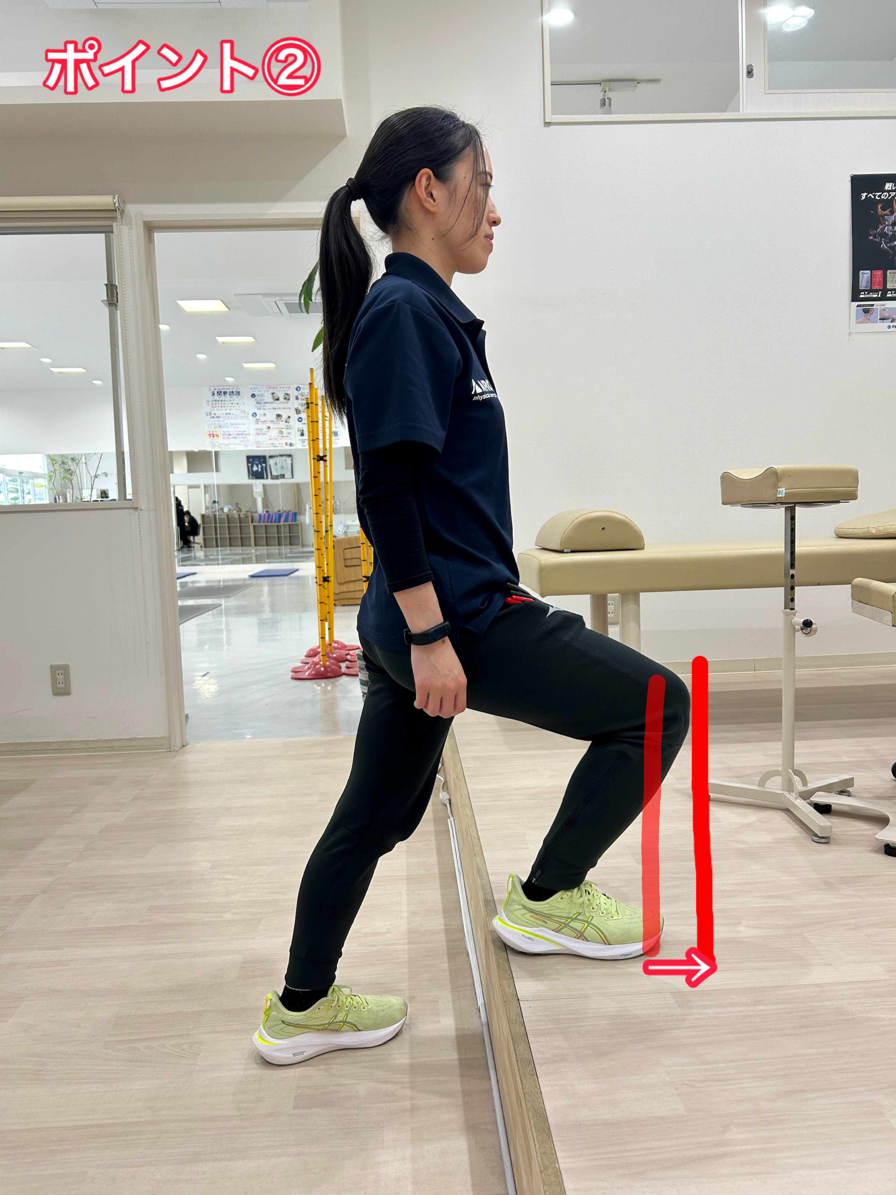 目線が上がると重心が後ろに残り、それをカバーしようとして膝の前側に過度な負担がかかります。