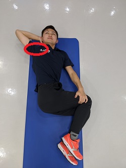 鎖骨の下にボールを当ててうつ伏せに寝ながら、痛いところにボールを当てていきます。