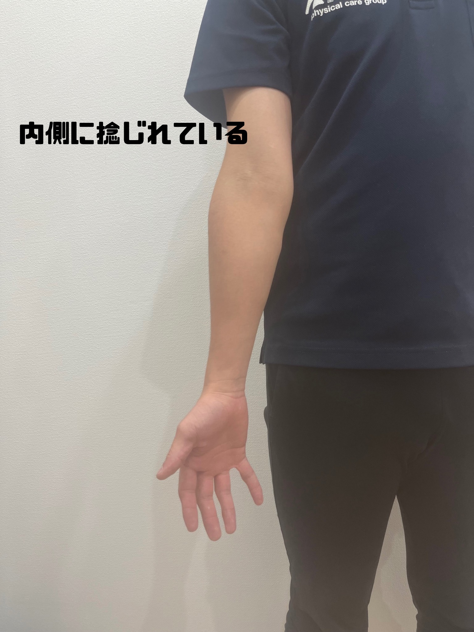 実際に手のひらを上に向けた状態で肘を曲げるのと手の甲を上に向けた状態で肘を曲げるのでは手のひらを上に向けるよりも手の甲を上に向けた状態、いわゆる腕が内側に捻じられているほうが肘関節でのつまり感を感じると思います。