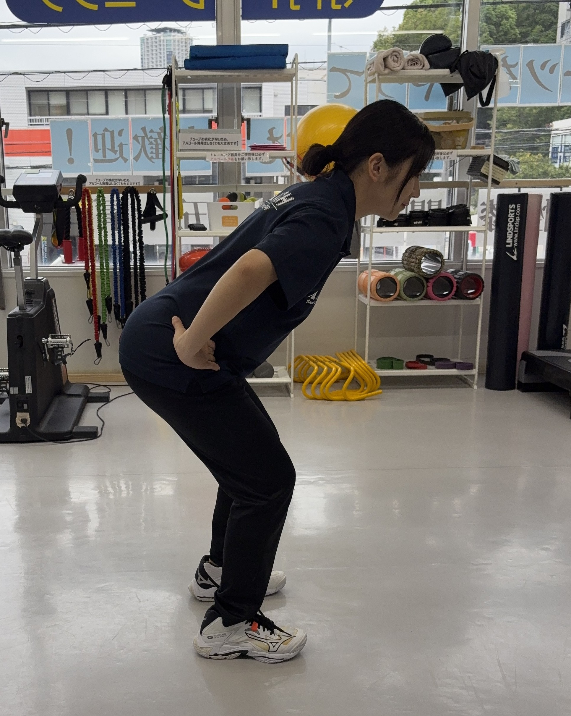 身体は真っ直ぐで手を重ねた状態で腕を後ろへ引く90度近くまで上がればOK