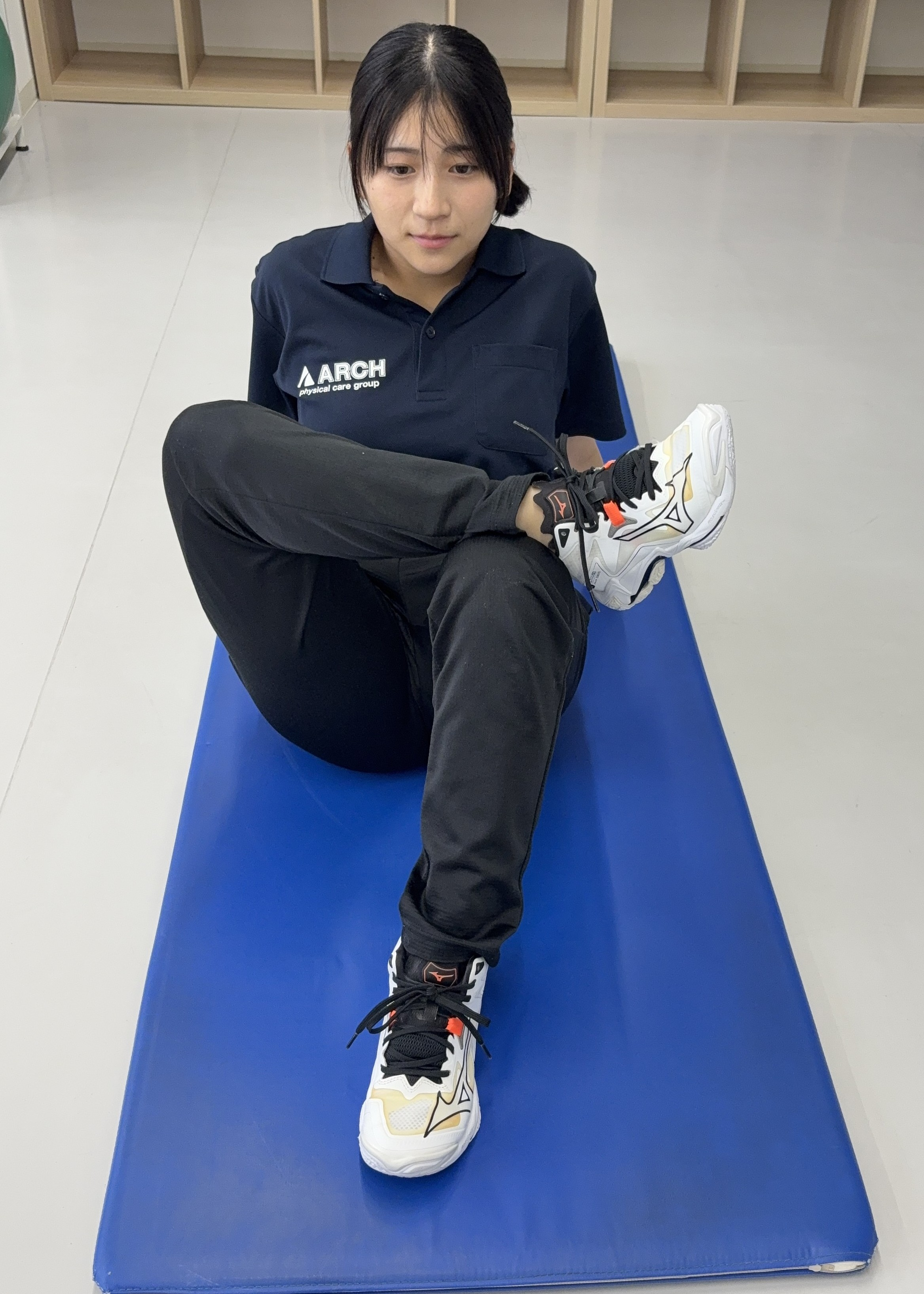 座った状態で手と肘を保持して可動域確認(セカンドポジション)