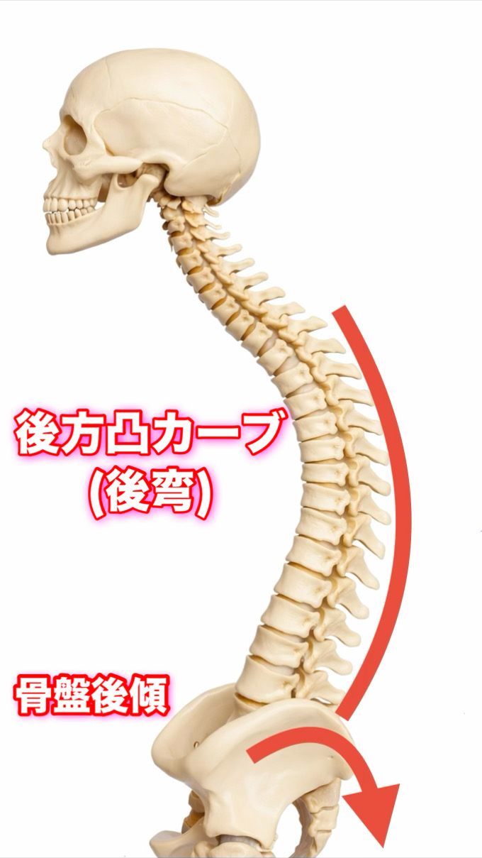 背骨は骨盤をつくる仙骨まで繋がっていますので、骨盤が前へ傾けば腰部分の背骨のカーブは自然と前方凸方向となります。